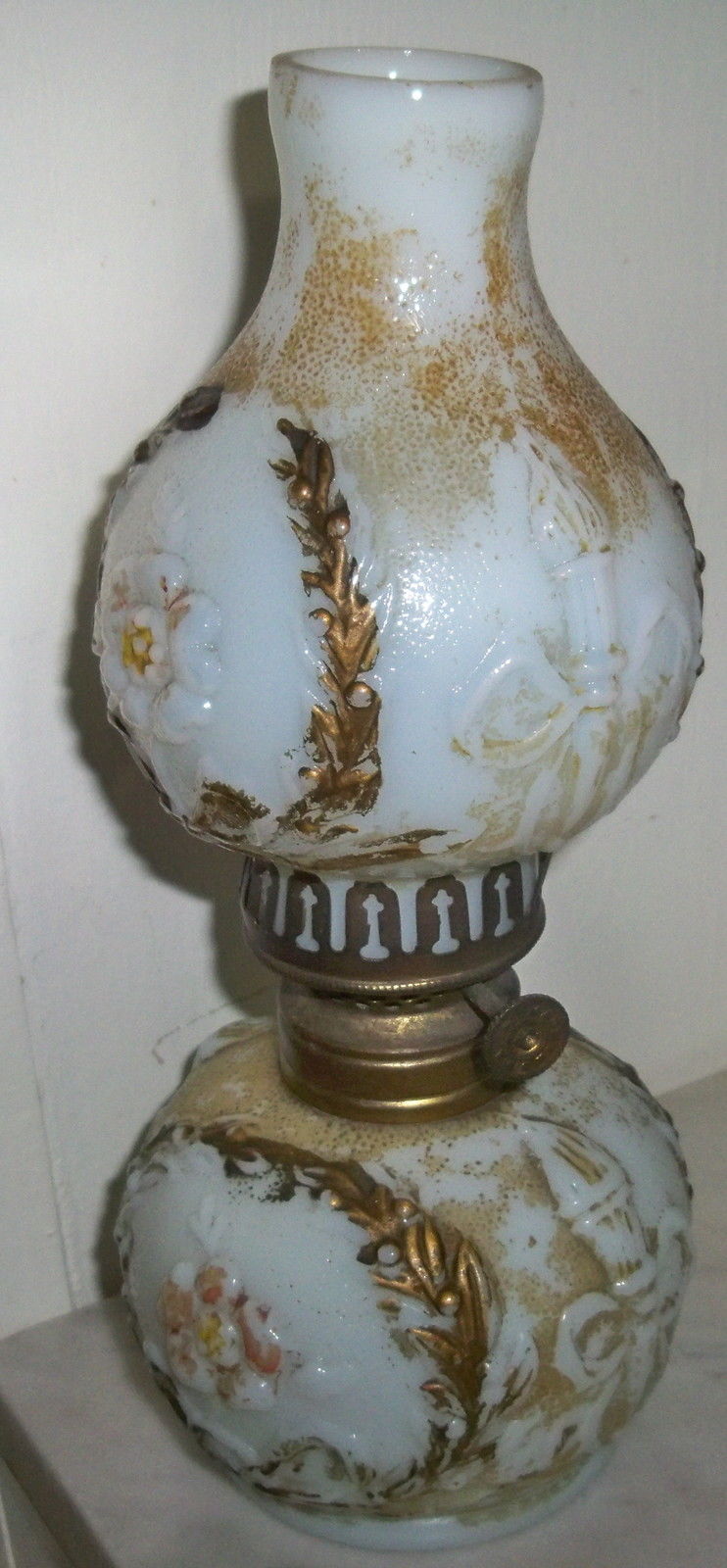 Title (ebay affiliate link): 8 1/4" ANTIQUE VICTORIAN MILK GLASS DECORATED RELIEF WORK MINIATURE OIL LAMP
