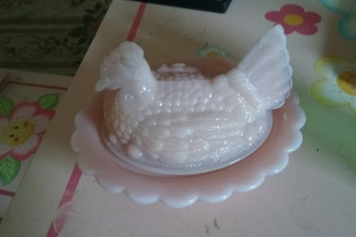 Title (ebay affiliate link): MOSSER GLASS CROWN TUSCAN (PINK MILK) GLASS HEN CHICKEN ON NEST NESTS