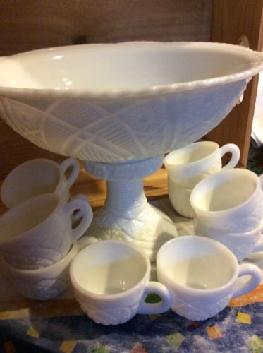 Title (ebay affiliate link): Vintage McKee Concord Milk Glass Punch Bowl Set 10 Cups & Pedestal Stand