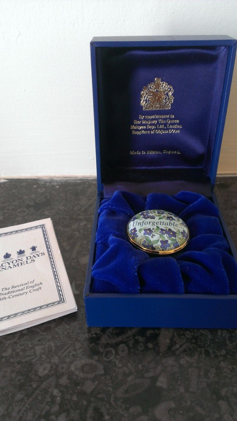 Title (ebay affiliate link): Halcyon Days Enamels Unforgettable (Song) Screw Top Pill Box Forget Me Knots MIB