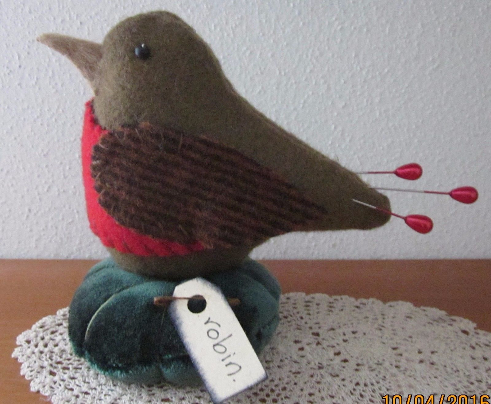 Title (ebay affiliate link): PRIMITIVE WOOL VELVET ROBIN BIRD MAKE DO PIN CUSHION PFATT