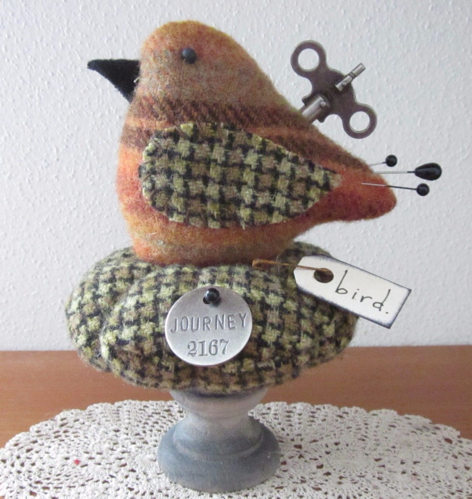 Title (ebay affiliate link): PRIMITIVE WOOL STEAMPUNK BIRD CHARM MAKE DO PIN CUSHION PFATT EHAG