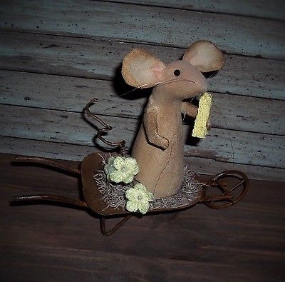 primitive folk art house mouse ornie country doll mice rusty tin wheel barrel