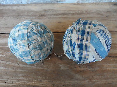 2 Large Antique Rag Balls Blue & White Gingham, Calico & Plaid Fabric Strips