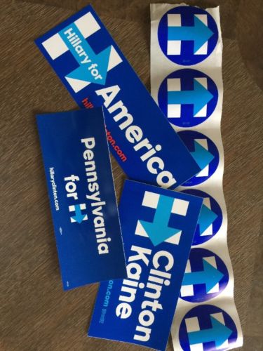 Title (ebay affiliate link): 3 Clinton Kaine Bumper Stickers 6 Hillary Stickers Made in USA Official Campaign