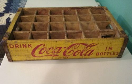 Title (ebay affiliate link): VINTAGE YELLOW COCA COLA 24 BOTTLE WOODEN CRATE CARRIER DATED 1965
