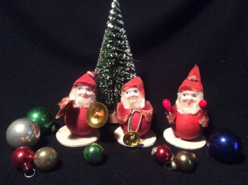 Title (ebay affiliate link): VINTAGE RED ELVES PUTZ & PLASTIC FACE CHENILLE MUSICIANS CHRISTMAS ORNAMENTS