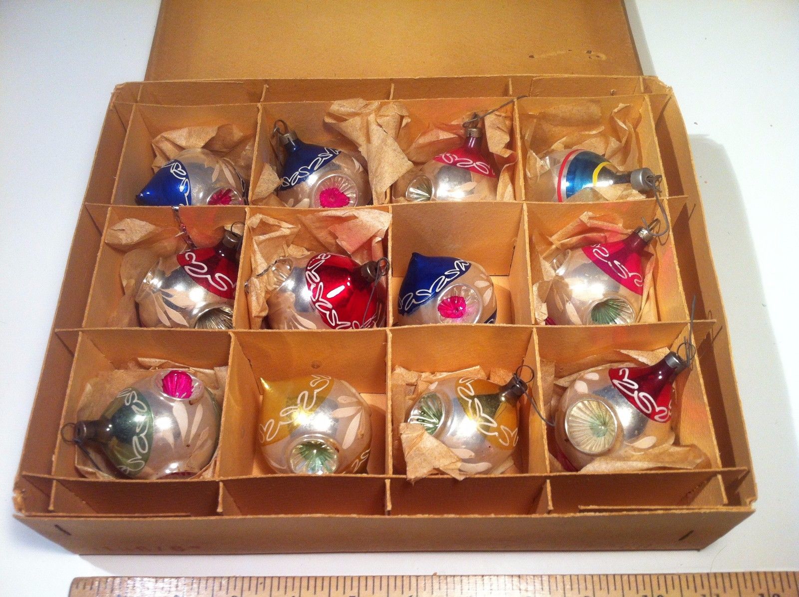 Title (ebay affiliate link): Box 11 Vtg Glass Xmas Ornaments Indents - Made in Czechoslovakia