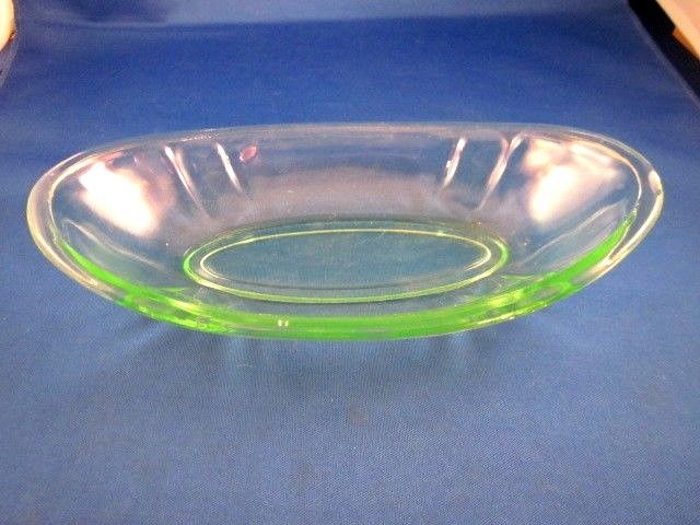 Title (ebay affiliate link): Vintage Green Depression Glass Oblong Bowl 2" tall 9" long