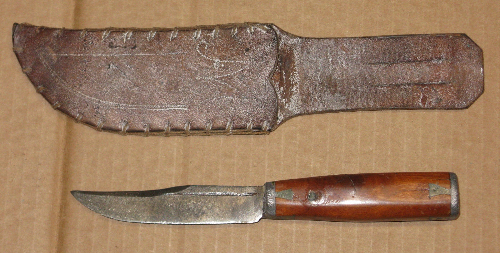 vintage antique fixed blade trade sheath knife carbon steel wood & pewter