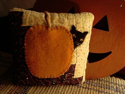 Title (ebay affiliate link): PRIMITIVE OLD WOOL PUMPKIN WITH BLACK PEEKABOO CAT PILLOW ~ HALLOWEEN ORIGINAL
