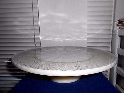 VINTAGE ANCHOR HOCKING FIRE-KING MILK GLASS & GOLD PATTERN PEDESTAL CAKE PLATE