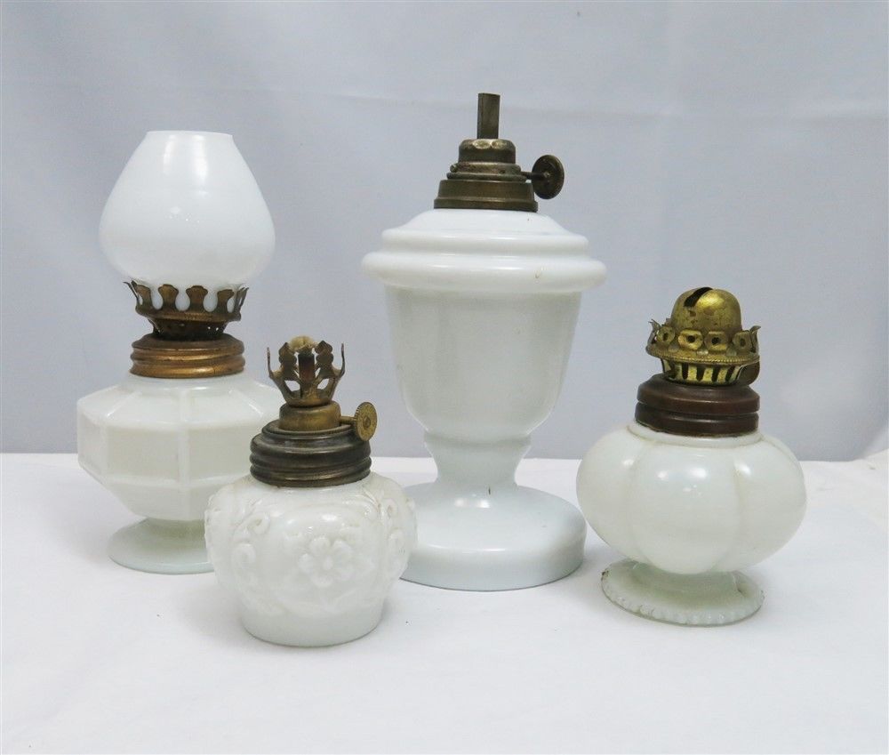 Lot of 4 Vintage White Milk Glass Miniature Oil Lamps