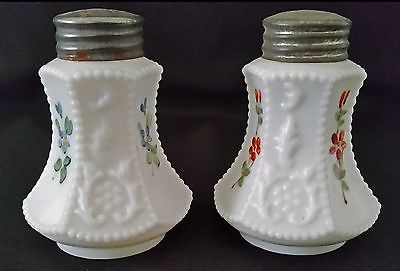 Vintage Milk Glass Salt Pepper Shakers, panels w/ scrolling, beading & flowers