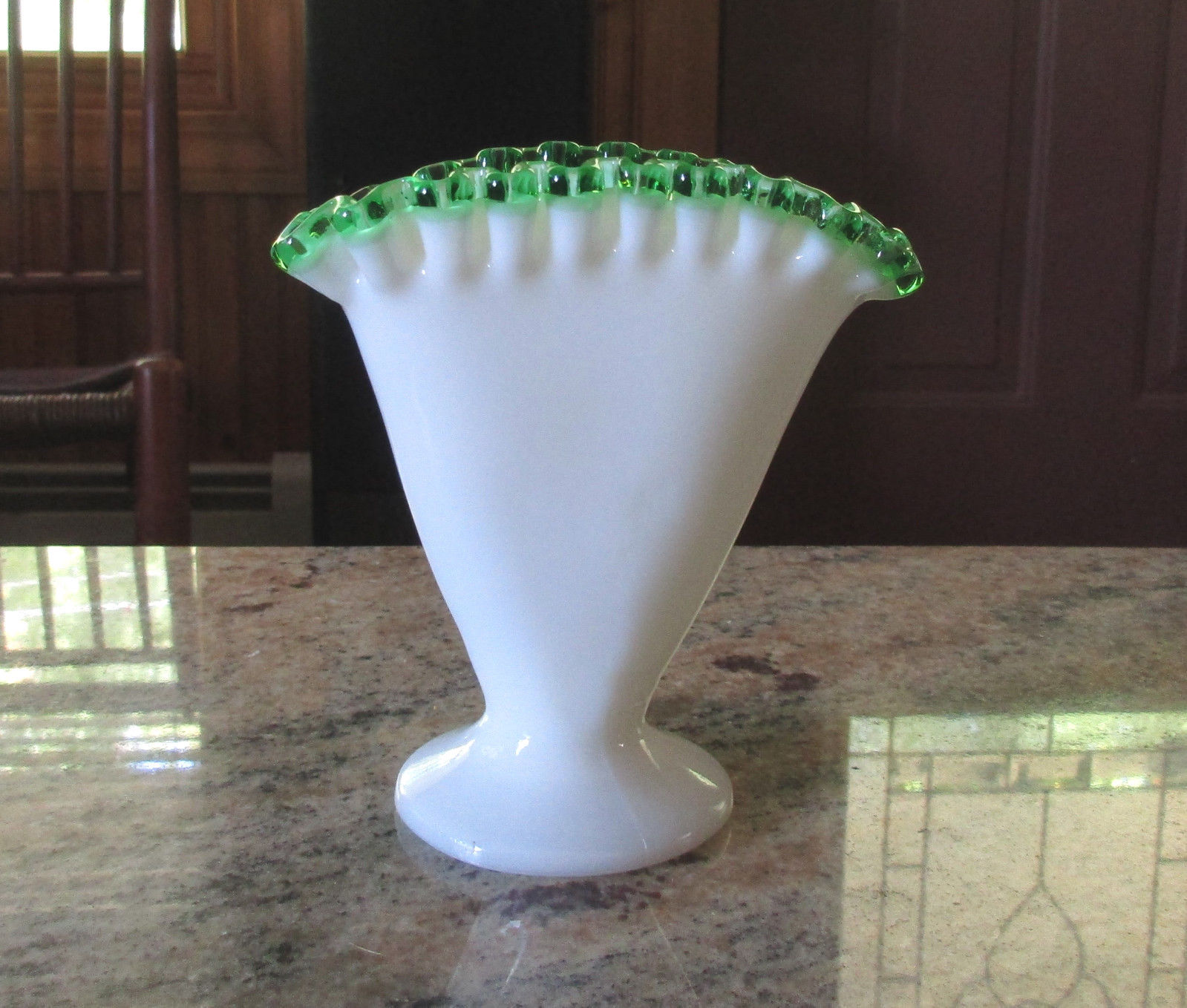 Title (ebay affiliate link): Vintage Fenton 4 1/2" Tall Milk Glass Green Crest Fan Vase