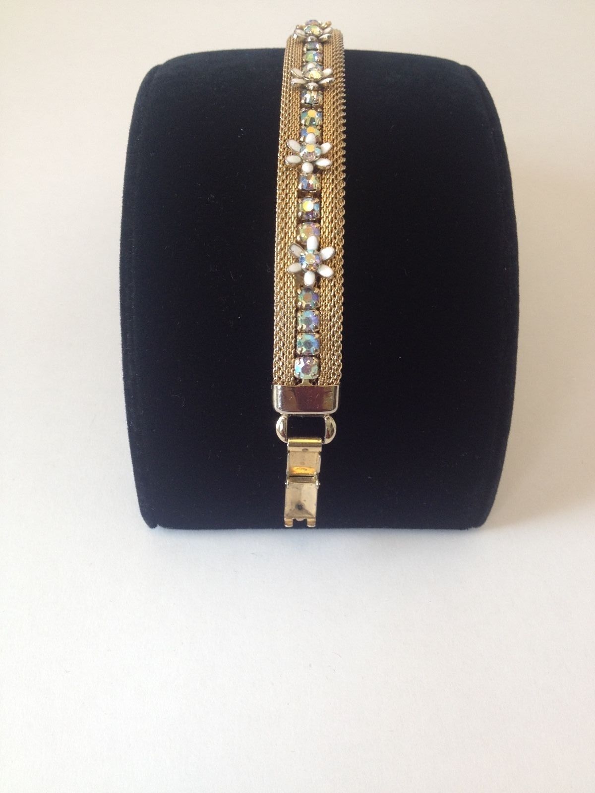 Title (ebay affiliate link): Vintage Weiss Petite White Milk Glass Flowers AB Rhinestones Mesh Bracelet