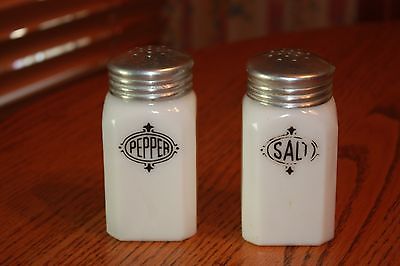 Vintage Hazel Atlas White Milk Glass Range Salt & Pepper Shakers Black Shield