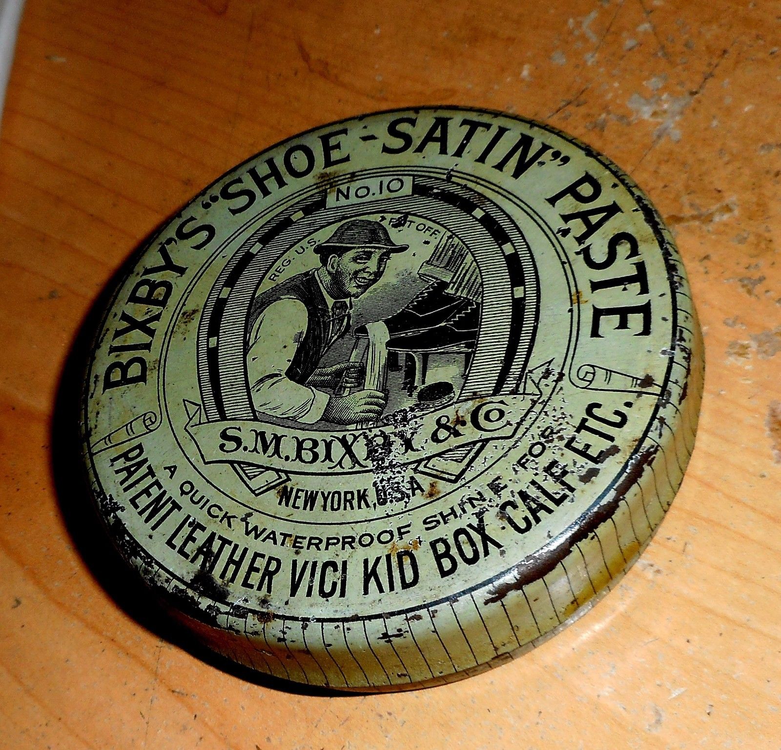 Title (ebay affiliate link): 3 1/4", Antique BIXBY'S, N.Y. Tin with Picture of a BOOTBLACK Polishing Shoes.