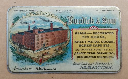 Burdick & Son,Decorated Tin Boxes,Albany,N.Y.,Tin Trade Card,1880's-1890's