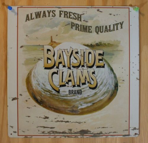 Title (ebay affiliate link): Bayside Clams Brand Tin Metal Sign Ocean Decor Seafood Light House Vntg AD E11