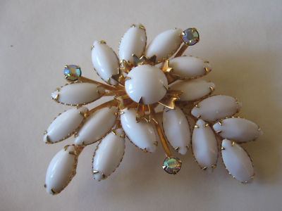 VINTAGE WHITE MILK GLASS & RHINESTONE LARGE BROOCH PIN