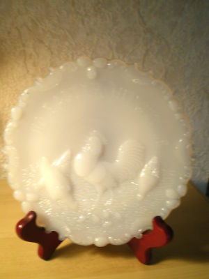 EMBOSSED MILK GLASS PLATE~ROOSTER AND CHICKENS