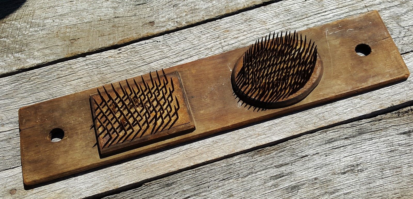 Title (ebay affiliate link): Antique Primitive Hetchel Double Flax Comb Wooden Wool Tool signed P. R. Gromer