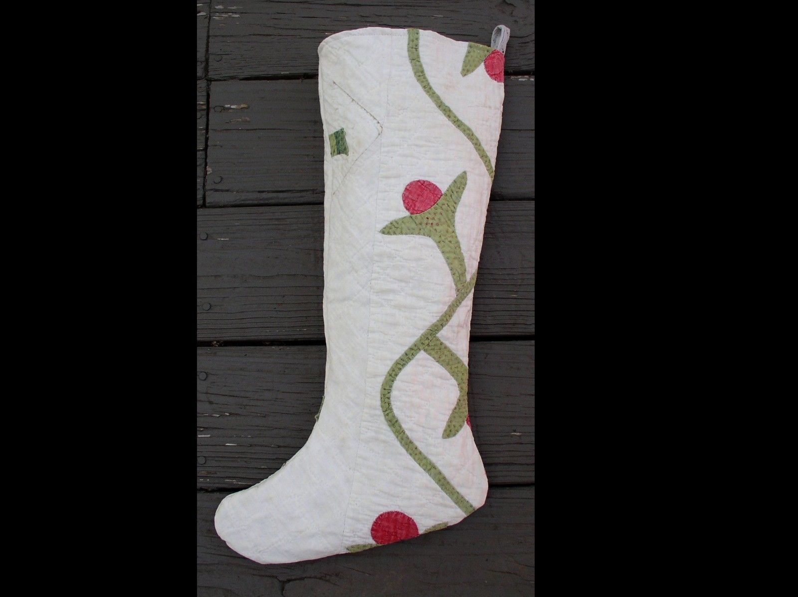 Title (ebay affiliate link): PRIMITIVE VINTAGE CUTTER QUILT CIRCA 1890 CHRISTMAS STOCKING BLOOMS/VINES