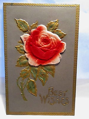 1910 POSTCARD HIGH EMBOSS WITH FLOCKED RED ROSE, BEST WISHES, GOLD BORDER