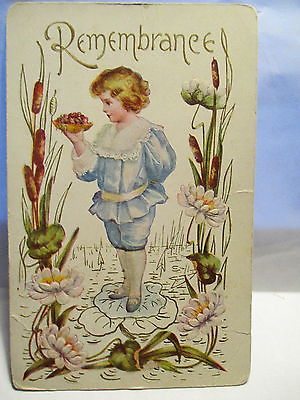 1910 POSTCARD REMEMBRANCE, BOY ON LILY PAD