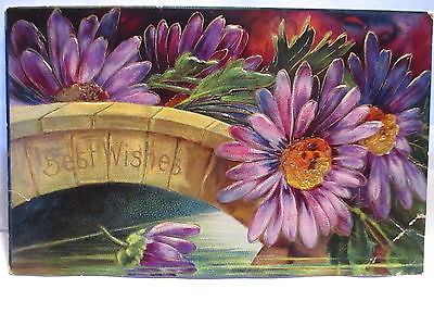 1910 POSTCARD BEST WISHES, COLORFUL PURPLE FLOWERS
