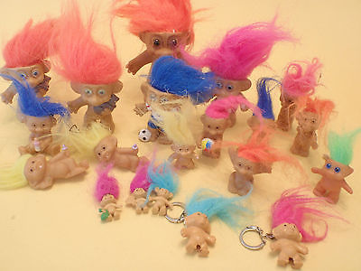 Collection of 20 vintage China Trolls - 17 dolls, 2 key chains, 1 doll with pin