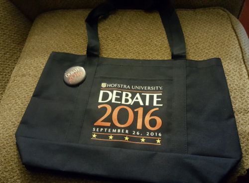 Title (ebay affiliate link): 2016 presidential debate tote and pin Hillary and Trump