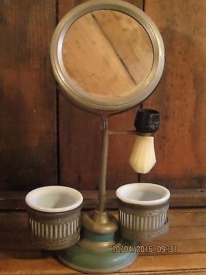 PRIMITIVE~ANTIQUE~VINTAGE~BRASS GERMAN SHAVING MIRROR & MILK GLASS SHAVING CUPS