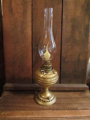 ANTIQUE~VINTAGE~CONVERTED SMALL BRASS OIL LAMP WITH CHIMNEY