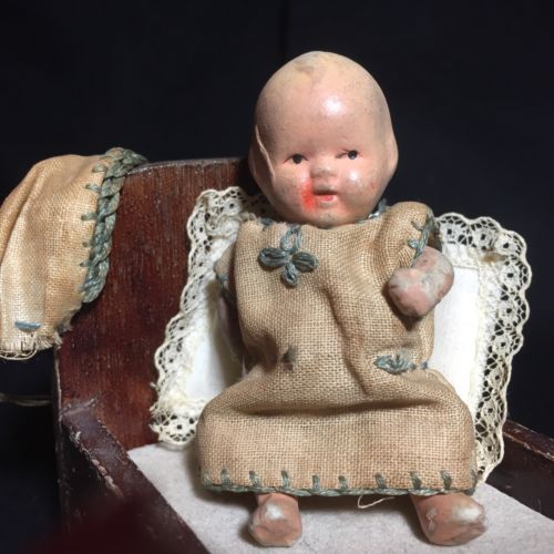 Title (ebay affiliate link): Antique Primitive Bisque Toy Doll w& Bed Cradle & Lace Pillow & 2 Outfits AAFA