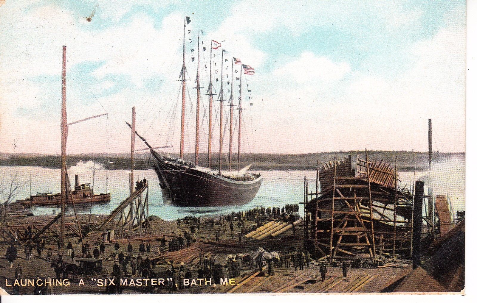Title (ebay affiliate link): U.S. SHIP POST CARD. LAUNCHING A SIX MAST SCHOONER AT BATH, MAINE