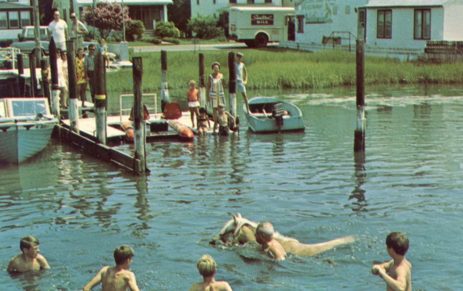 Chincoteague VA Virginia postcard, Cloudy the Pony swimming, Milk Truck, boats