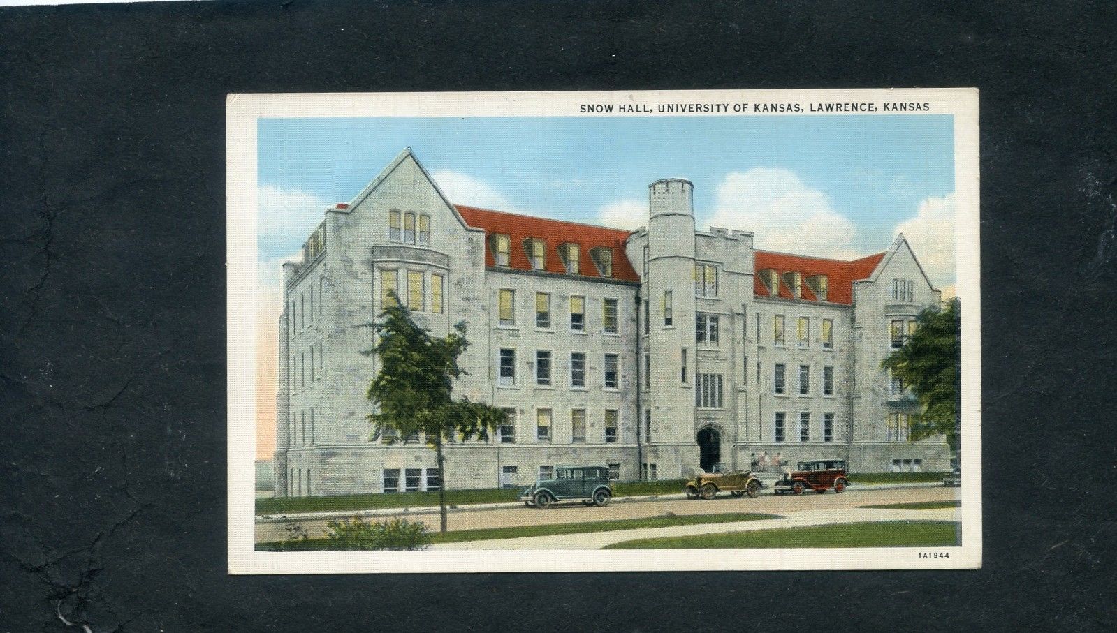 Lawrence Kansas KS postcard, 1920's cars, University of Kansas, Snow Hall