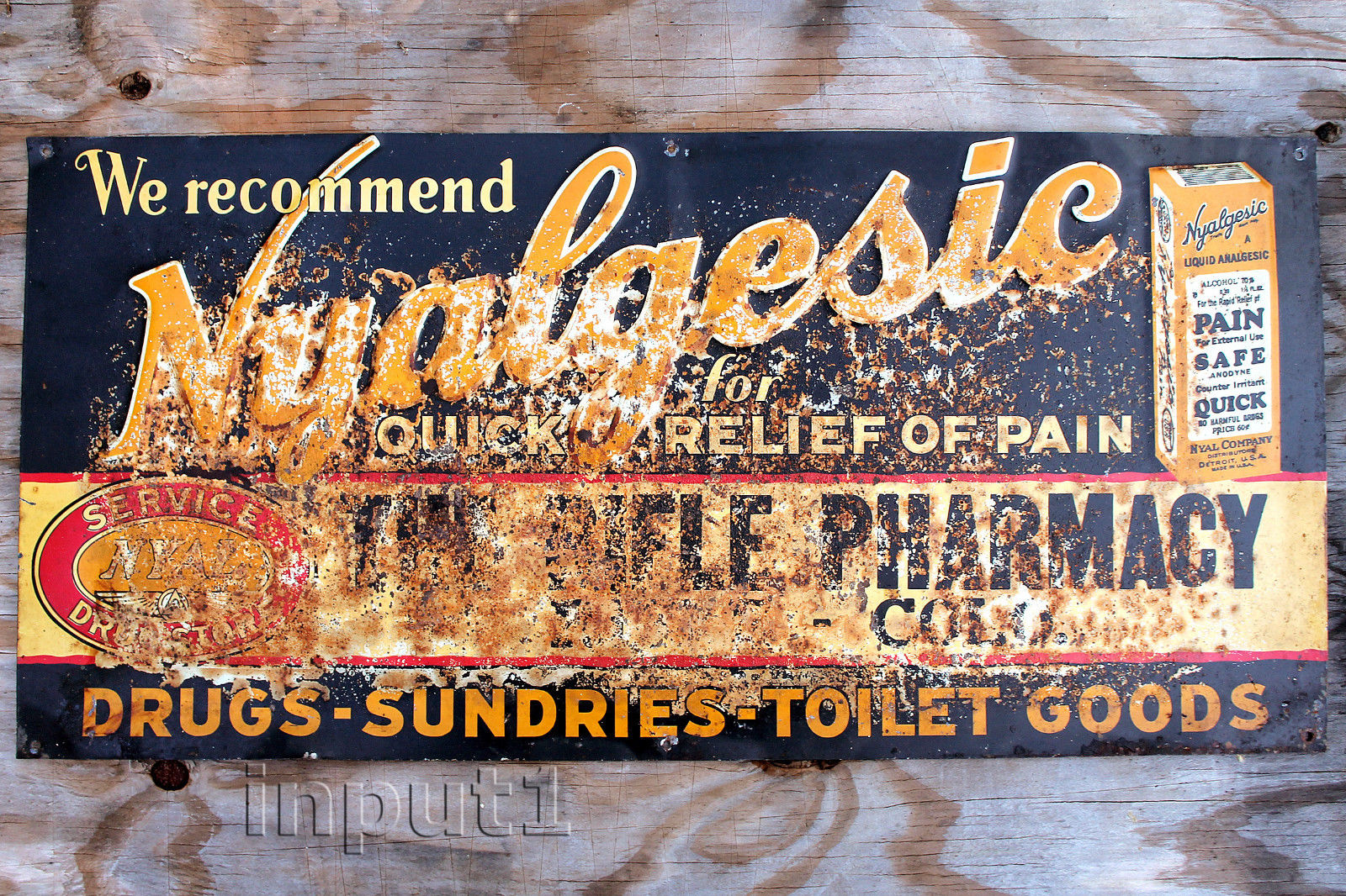 Title (ebay affiliate link): NYALGESIC / The Rifle Pharmacy / Rifle - Colo. embossed tin tacker *rough