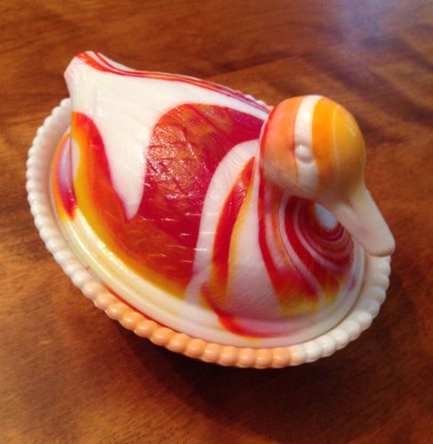 Title (ebay affiliate link): Westmoreland Milk glass Pintail Duck on nest 5 1/2" Orange/Red/Yellow Swirl Slag