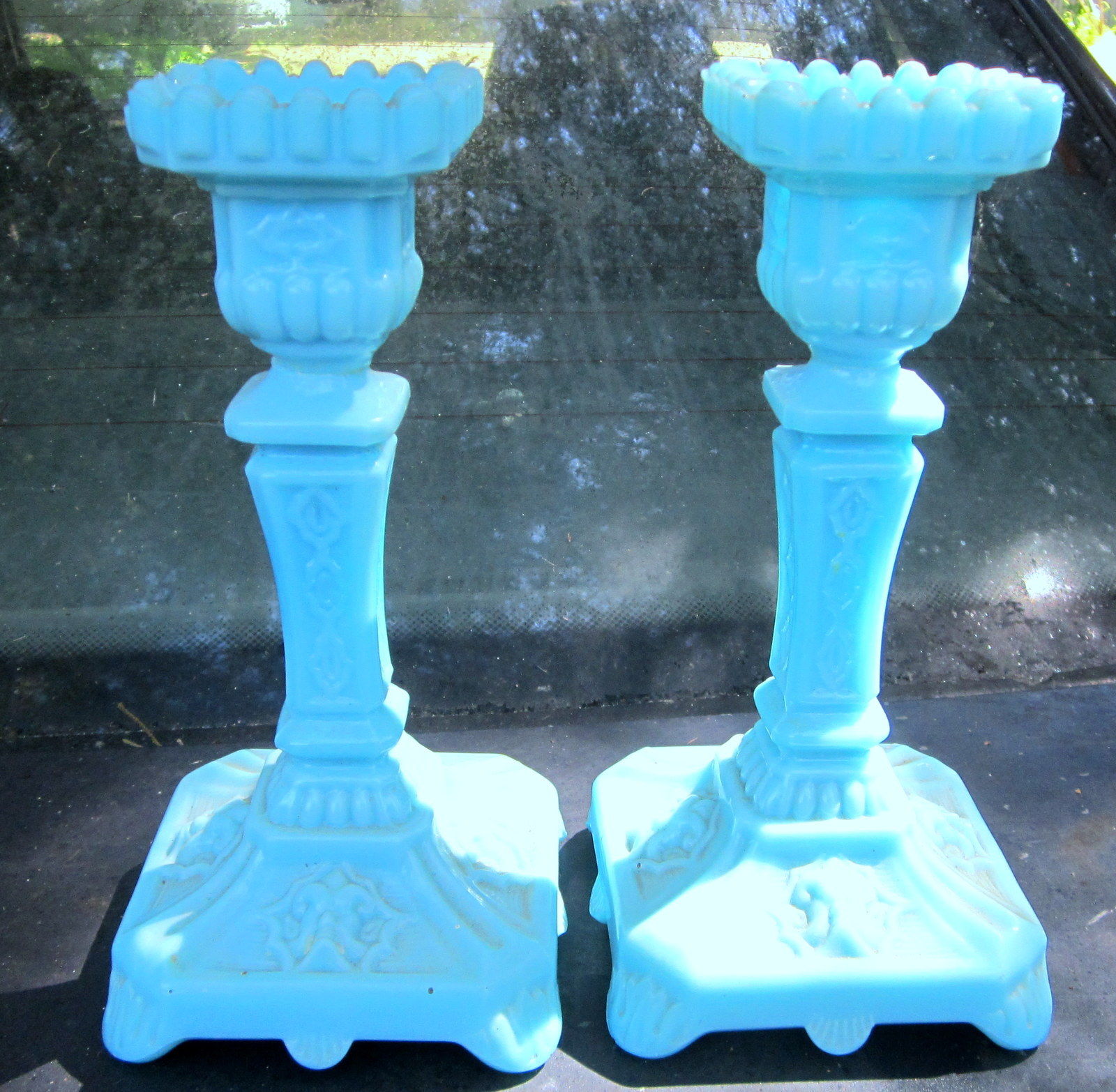 Title (ebay affiliate link): pair of vintage light blue milk glass candle sticks - 7 3/4" tall - 1 damaged