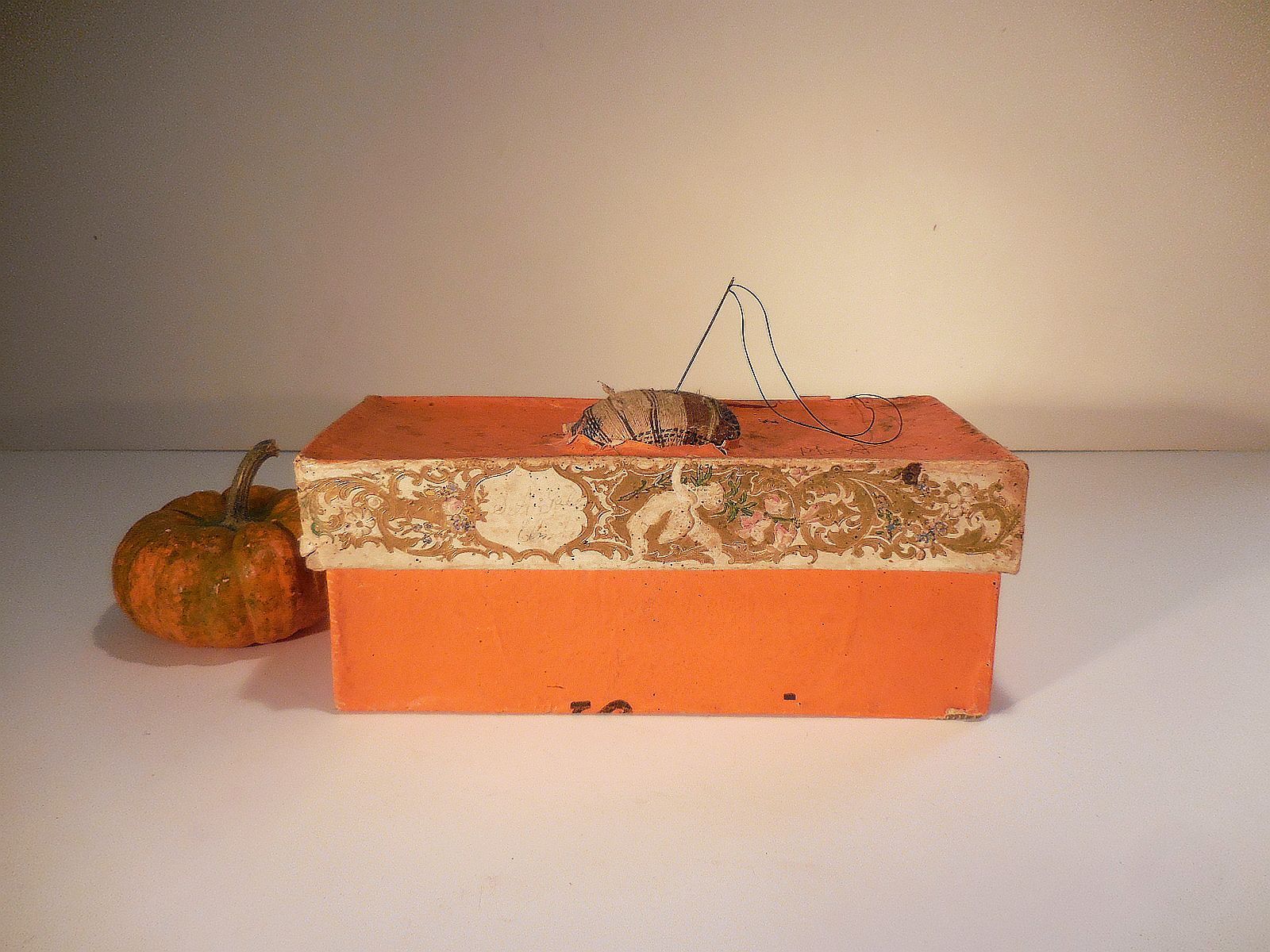 Title (ebay affiliate link): AAFA 19th c Wallpaper Box Sewing Box Pin Cushion Signed Cherub Gold Gilt Trim