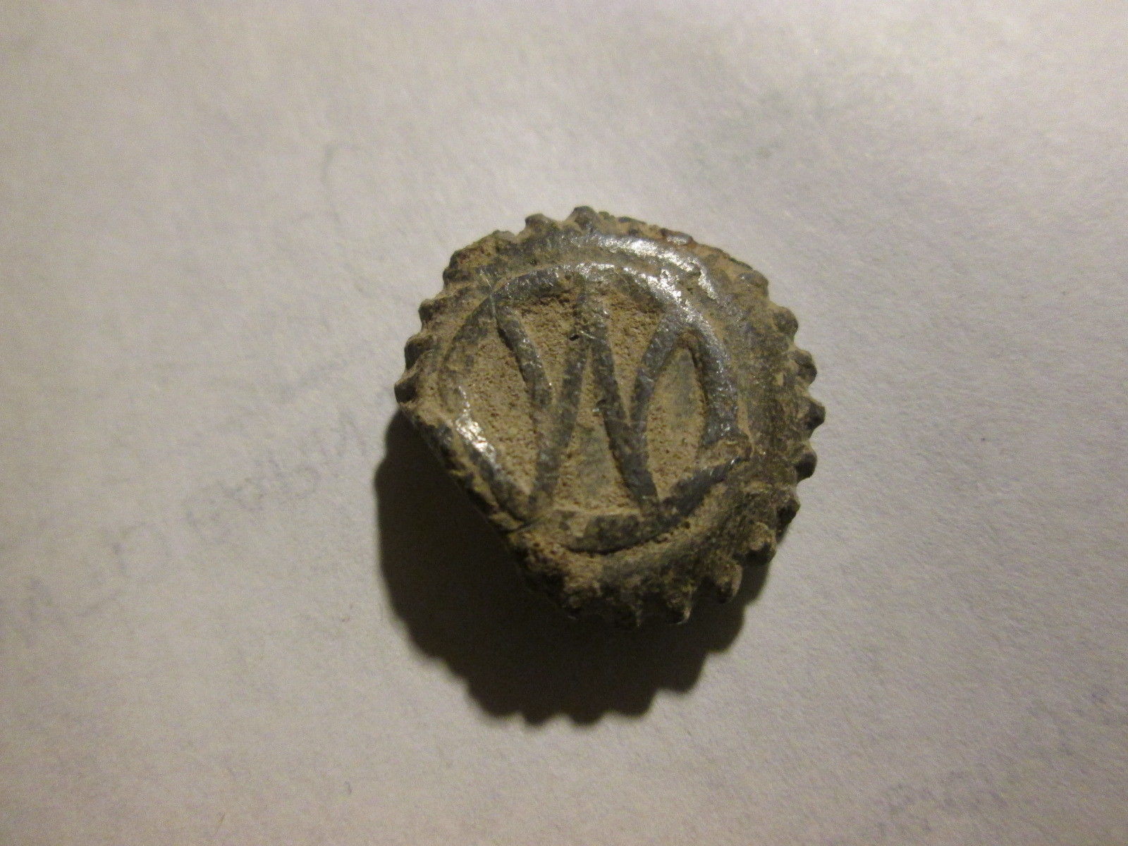 Title (ebay affiliate link): ANTIQUE LEAD BALE/ BAG SEAL, NOTCHED EDGE, MARKED "M" OR "W" IN CIRCLE, K2 "?"