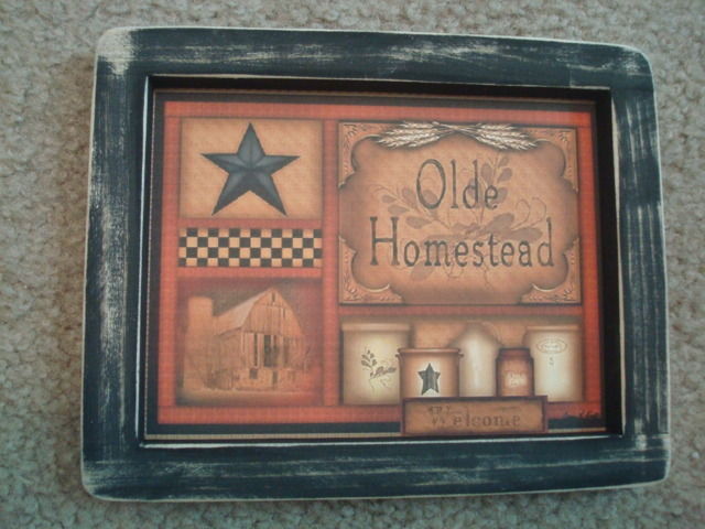 Title (ebay affiliate link): Primitive Country Print **OLDE HOMESTEAD** black frame 8" x 6"