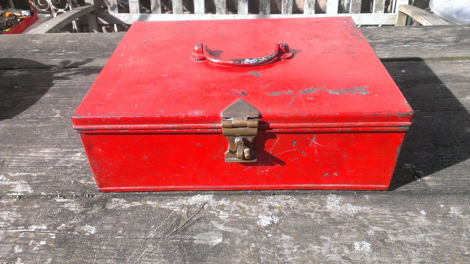 Title (ebay affiliate link): Antique Vintage Red Metal Brass Catch Steel Box Storage Chest Tool Compartments
