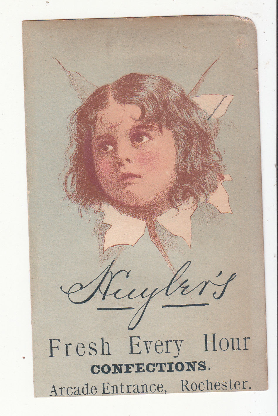 Huyler's Confections Arcade Rochester NY Head Tearing Paper Vict Card c 1880s