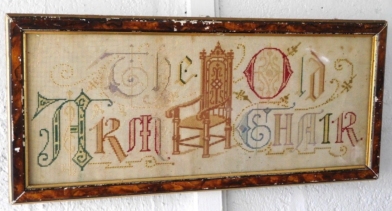 Title (ebay affiliate link): 1880's 'THE OLD ARM CHAIR' Antique Framed Sampler Needlepoint Primitive Country