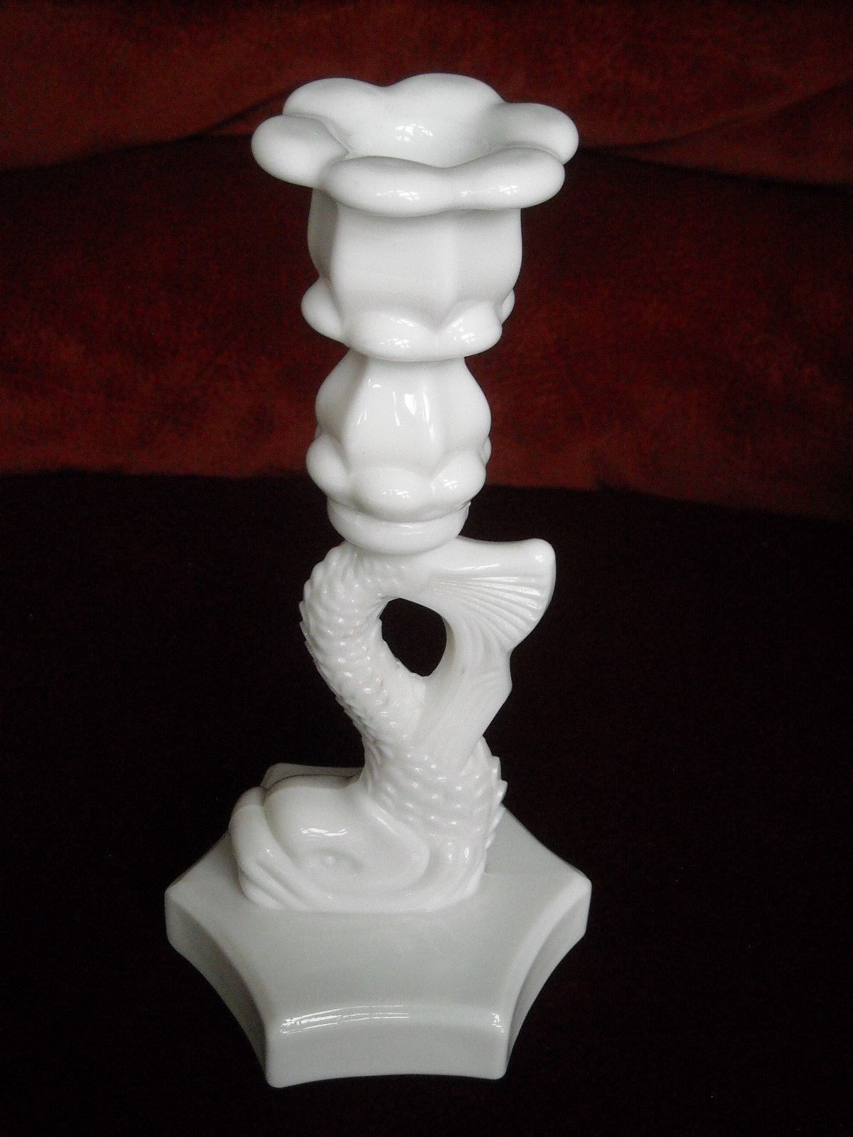 WESTMORELAND WHITE MILK GLASS DOLPHIN CANDLESTICK 9"