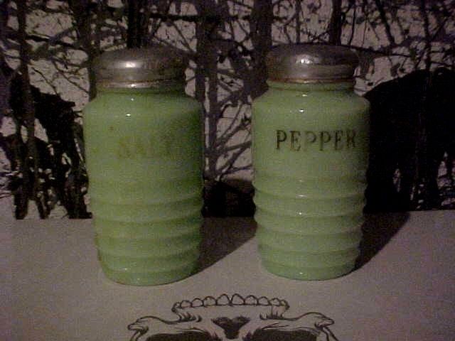 Title (ebay affiliate link): Vintage Green Milk Glass Salt & Pepper Shakers (ca. 1930-40s)